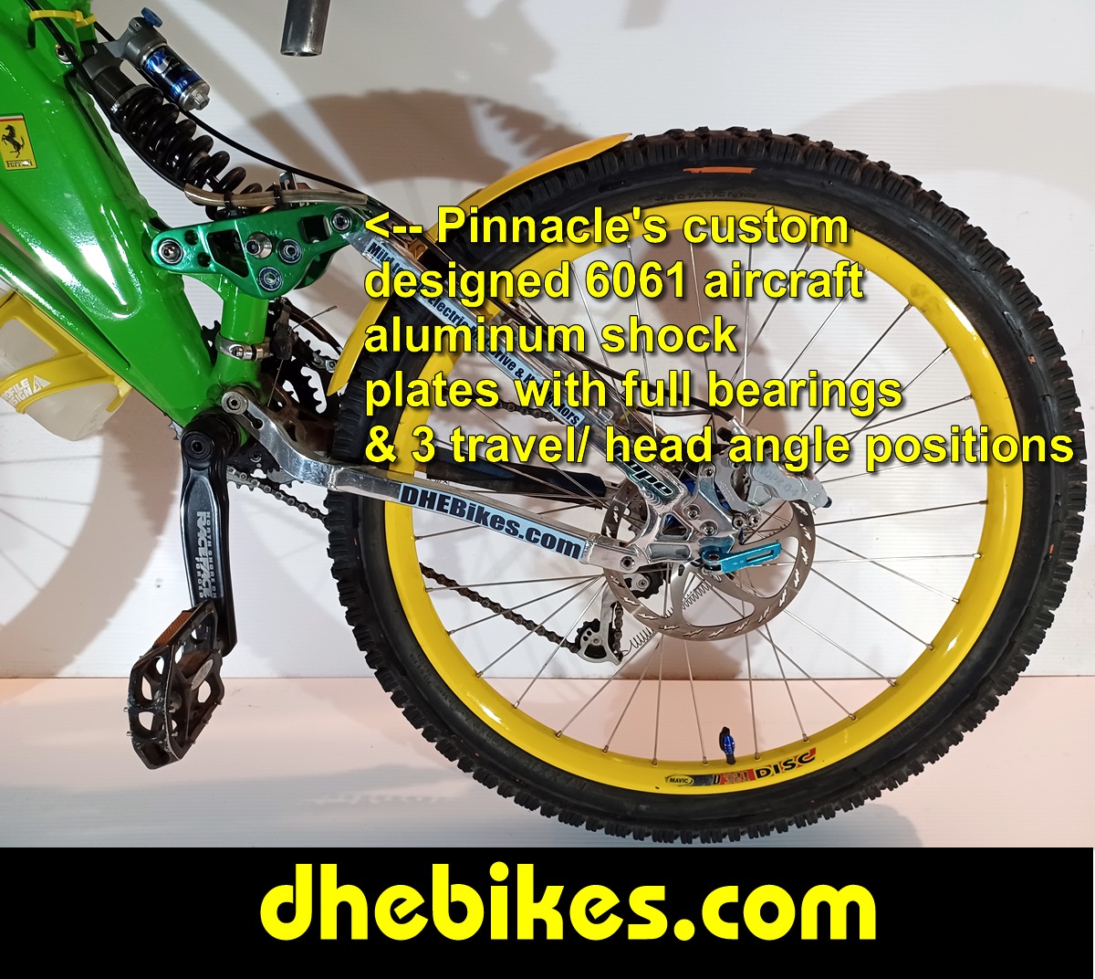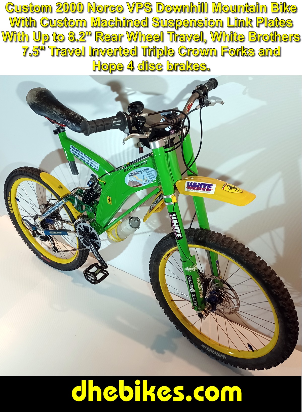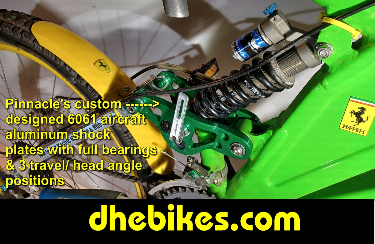 With my racing and freeriding experience, I quickly found that I was breaking frames. I first started racing on Giant ATX dual suspension mountain bikes, then Mountain Cycle before sticking with Norco Downhill Mountain Bikes. Even though the Norco's were well built, I was still able to break their frames - even with their standard equipped 6" or so rear wheel travel and up to 7 1/2" front fork travel with my White Brothers inverted triple crown DH forks. Consequently, I decided to look at the rear suspension and design ways to increase the rear wheel travel. I found that by adding a longer travel rear shock and modifying the shock linkage plates to offer not only numerous head angle positions but also a variety of wheel travel positions. In my latest shock link plate designs, I have also extended the length of the shock link plates and fully equipped them with bearings on all pivot points - including the lower shock bolt holes. Now I can have as much as 10.2" of rear wheel travel on the yellow Norco Electric Downhill Mountain Bike featured on this website. Most importantly, we will build your downhill electric mountain bike exactly how you want it done! We also fully understand that what Men need in a bike can be quite different from what Ladies want or need in a bike. |